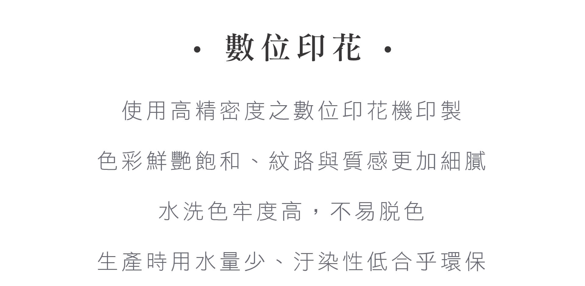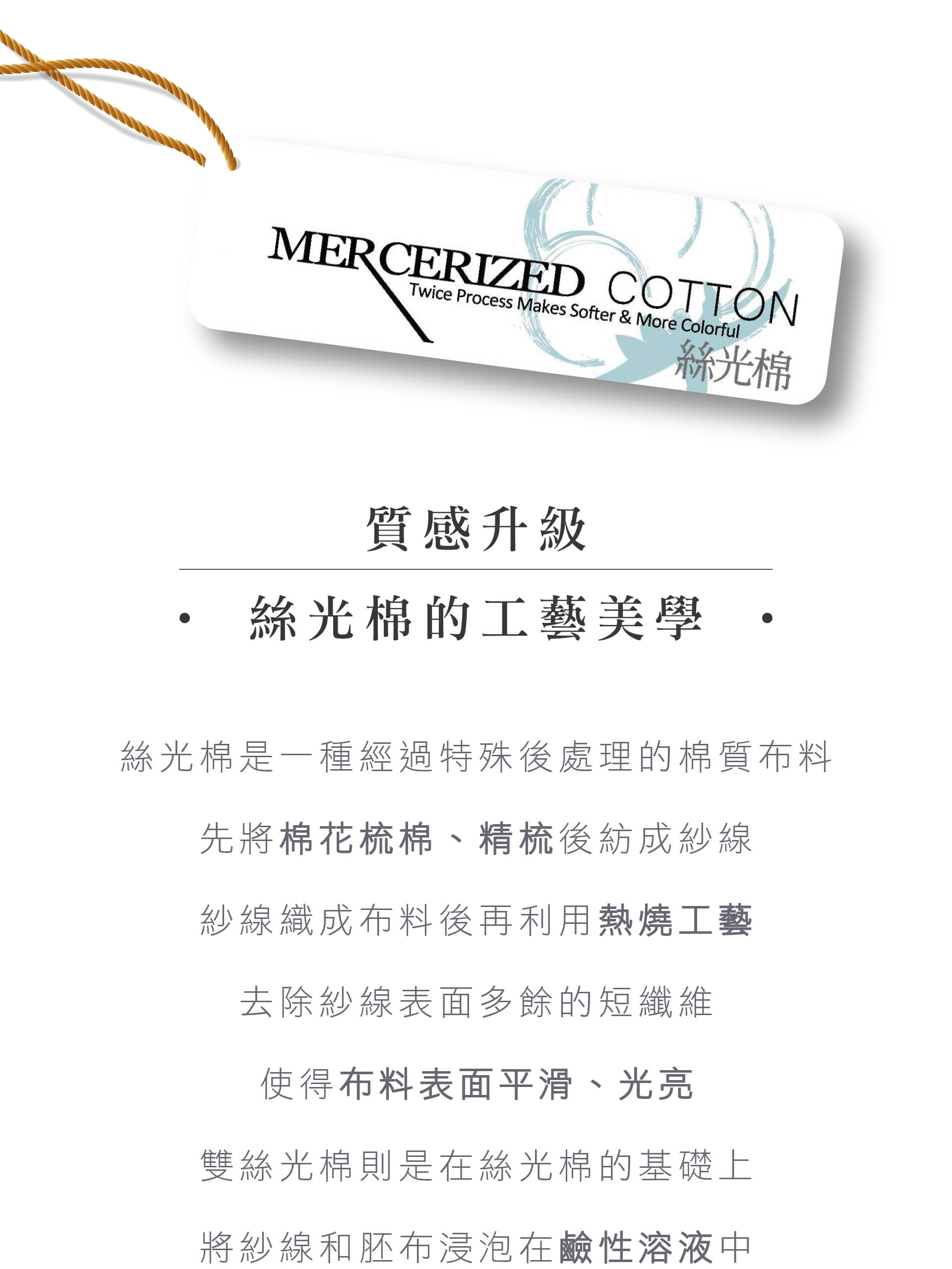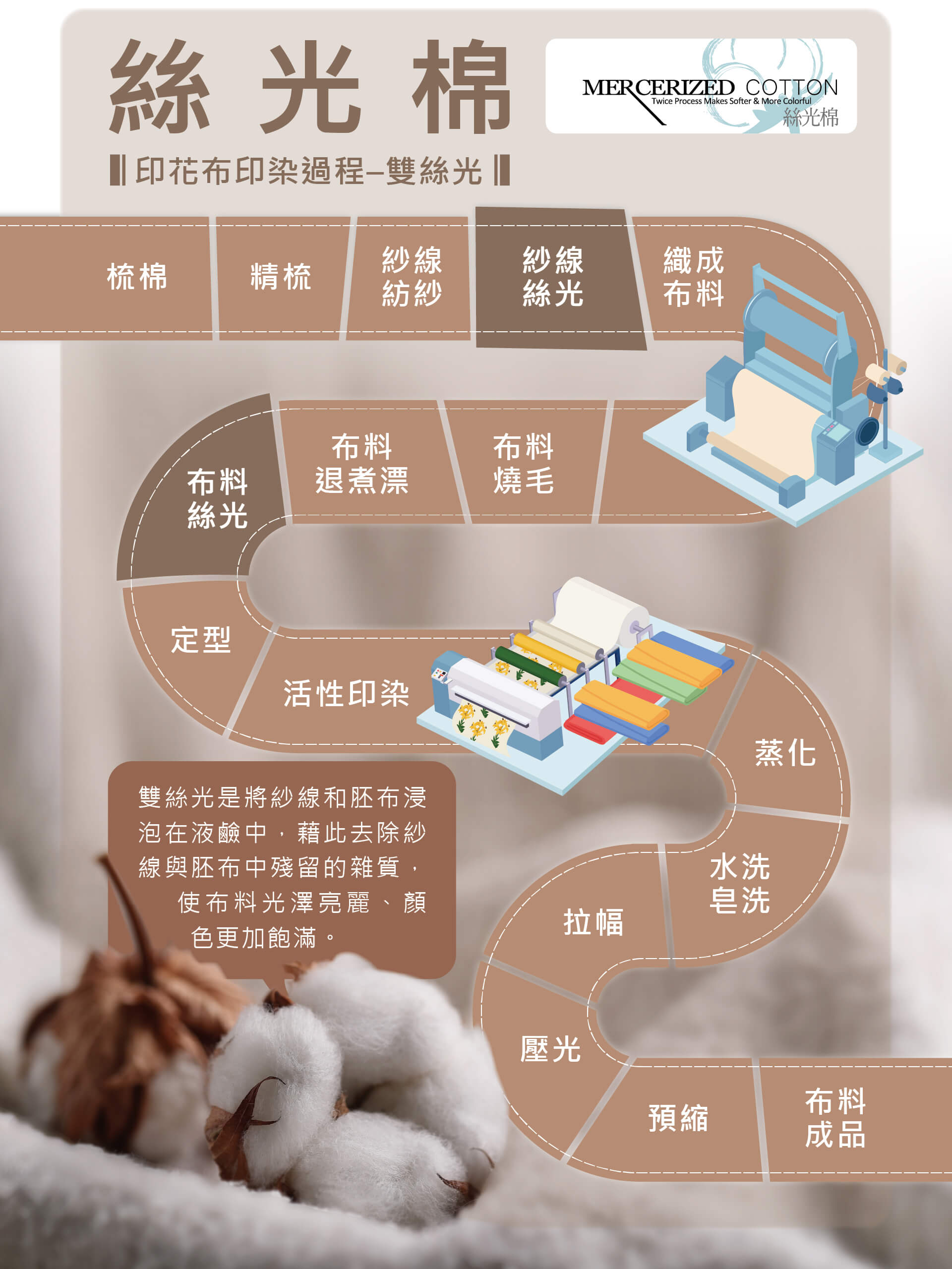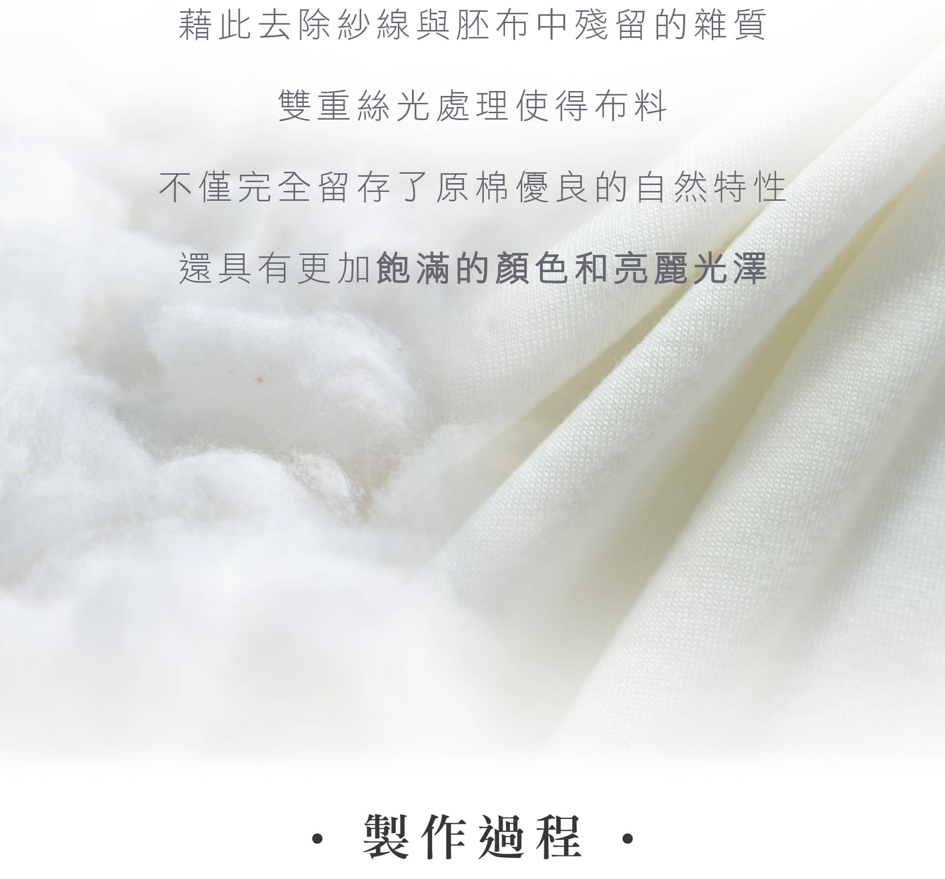 ‧ 使用雙次絲光工藝提升布料外觀和手感,將紗線和胚布進行絲光工藝,成品布料光澤更加亮麗、顏色更飽滿。