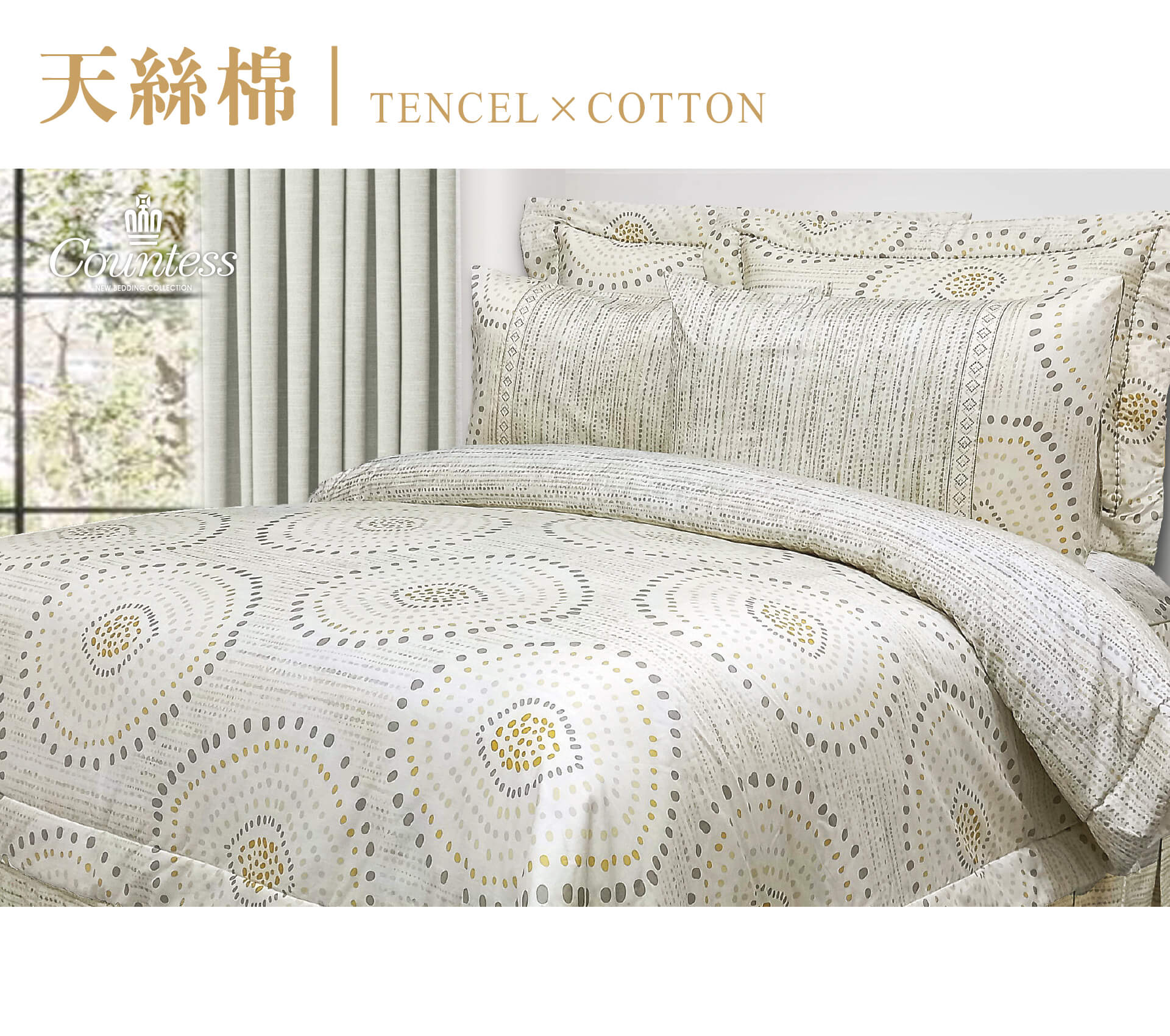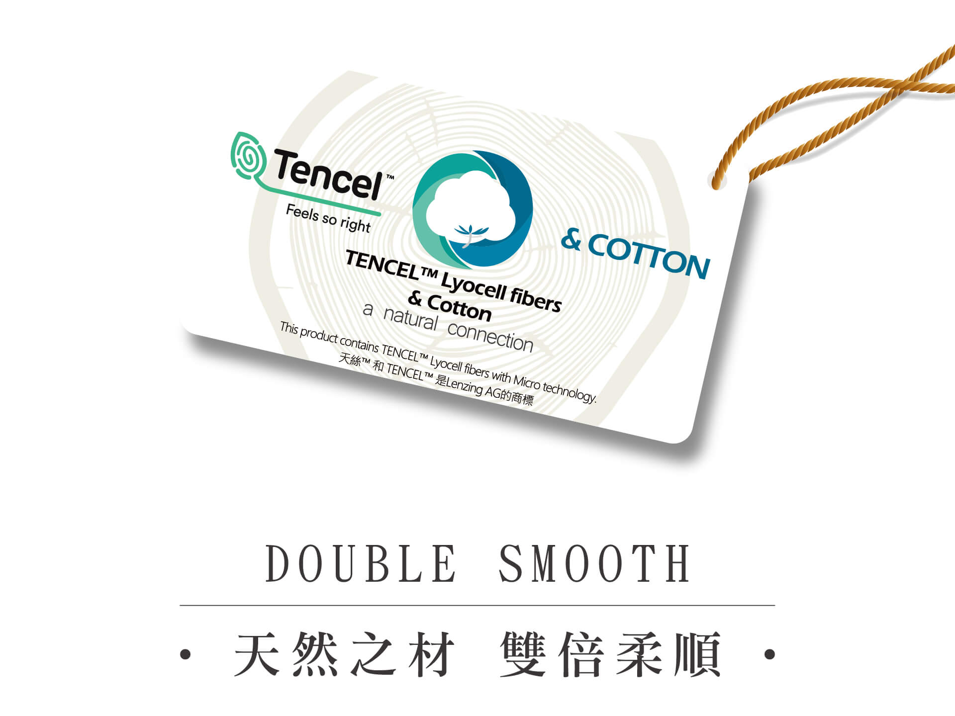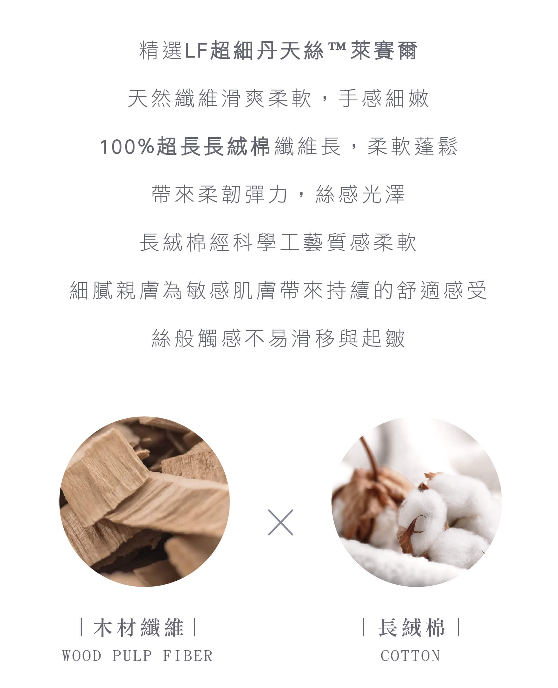 ‧ 80支LF超細丹天絲™ 與60支長絨棉交織而成。結合天絲的柔滑手感和棉花的親膚透氣,觸感極致。