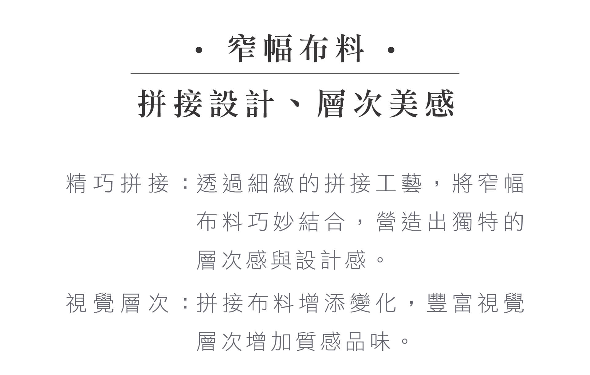 ‧ 使用窄幅布料,透過精巧的拼接工藝,有更豐富的層次感和設計感。