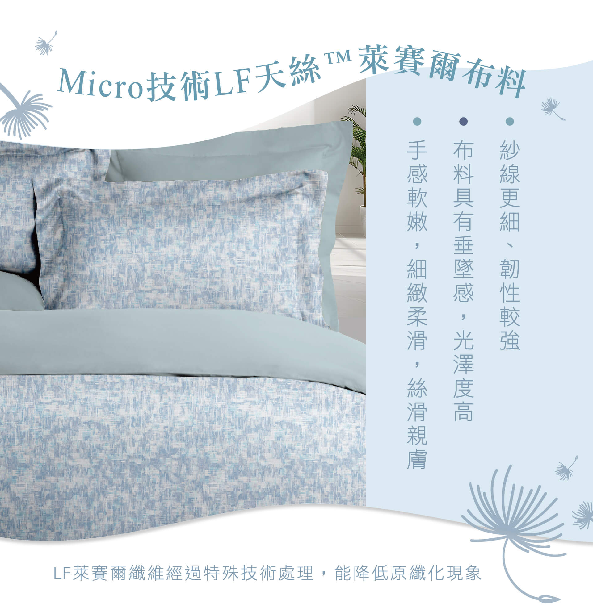 ‧ 60支 Micro LF 超細丹尼天絲™萊賽爾,纖維極細,絲滑親膚。