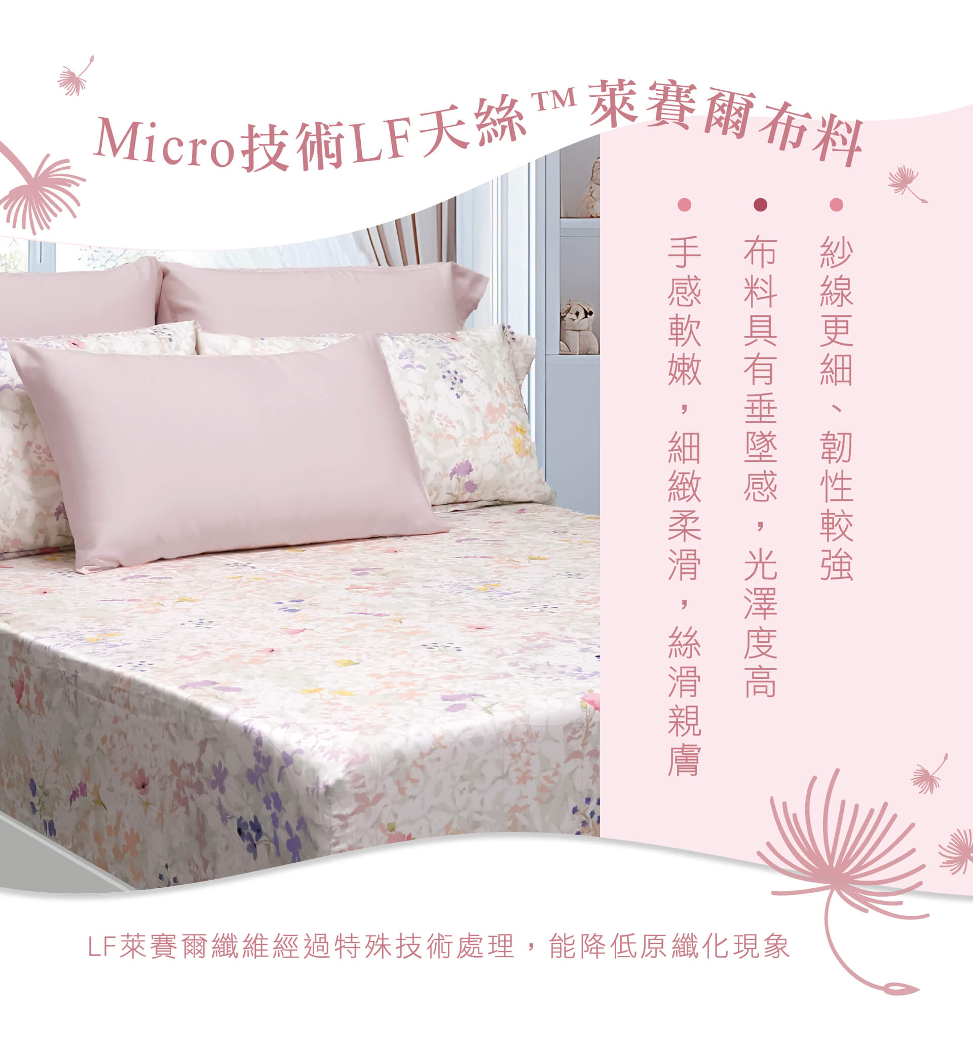 ‧ 60支 Micro LF 超細丹尼天絲™萊賽爾,纖維極細,絲滑親膚。